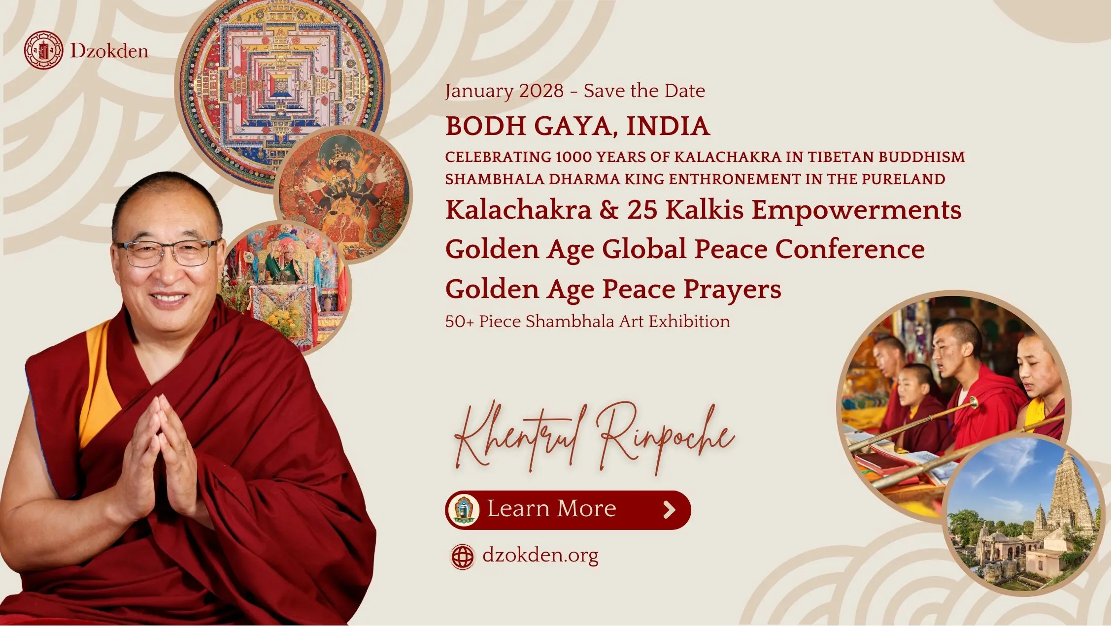 Be part of a once-in-a-lifetime moment in history—marking 1000 years of the Kalachakra Tantra in Tibetan Buddhism and the changing of the Kalki King in the sublime realm of Shambhala. You are invited to join Khentrul Rinpoche, monks of several lineages, Kalachakra experts, visionary leaders focused on peace and the Dzokden community in Bodh Gaya, the sacred place of the Buddha’s enlightenment, to receive the Kalachakra Empowerment and 25 Kalki Kings Empowerment, attend a Kalachakra Conference, and participate in Golden Age peace prayers dedicated to the awakening of our world.